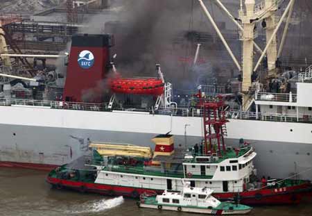 Dense smoke rises from "Kaili" fishing vessel berthed at a dock on the Huangpu River in Shanghai February 13, 2007. Equipments in the 7,000-ton ship were burnt out when the fire was put out, with no one injured in the accident. [CFP]