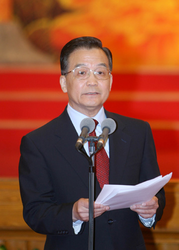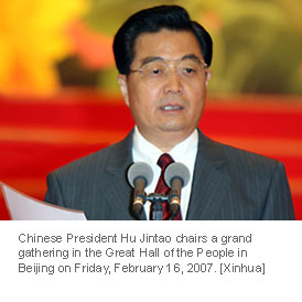 Chinese Premier Wen Jiabao delivered a speech at the grand gathering in the Great Hall of the People in Beijing on Friday, February 16, 2007. [Xinhua]