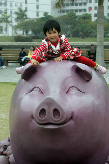 A little girl climbs onto a pig sculpture on Bai Luzhou Square in Xiamen of Southeast China's Fujian Province February 18, 2007, China's Lunar New Year's Day. People are allowed to sit on or climb onto the sculptures built for the New Year celebration. [newsphoto]