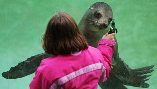 A child playfully teases a Californian sea lion in the Berlin zoo February 23, 2007. [Reuters]