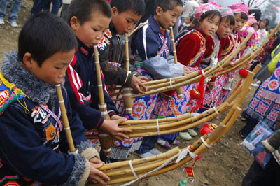 Children of Miao ethnic minority play the Lusheng, a traditional musical instrument during an annual festival 'Tiaohuachang' in hope of good harvest and amity with the neighbors in Guiyang, Southwest China's Guizhou Province February 26, 2007. The festival is held on the ninth day of the Lunar New Year every year. [Xinhua]