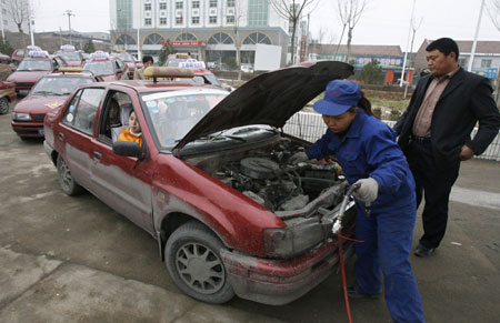 Methane-powered taxis queue at a gas station in Jincheng City, in north China's Shanxi province, March 1, 2007. China aims to reduce emissions of pollutants by 10 percent -- and the amount of energy required to generate each unit of gross domestic product by 20 percent -- between 2006 and 2010. Picture taken March 1, 2007.[Reuters]
