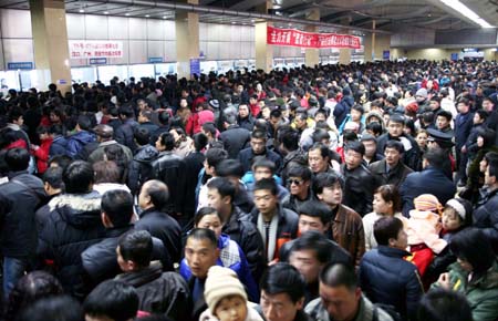 Travelers wait to refund their tickets at a railway station in Harbin, northeast China's Heilongjiang Province March 5, 2007. A number of passenger trains have been delayed or canceled due to a heavy snowstorm that swept through northeast China. [Xinhua]