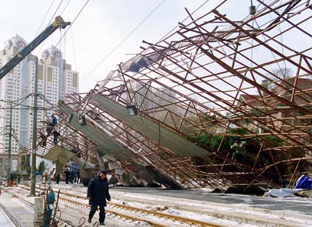 A pedestrian walks past a huge billboard blown down in a snowstorm in Dalian, northeast China's Liaoning Province March 5, 2007. [Xinhua]