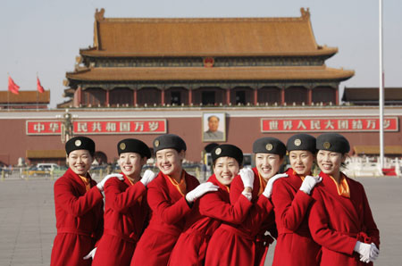 Hostesses for the National People's Congress (NPC) pose for pictures in Tiananmen Square during the third plenary session on the seventh day of the NPC in Beijing March 11, 2007. [Reuters]