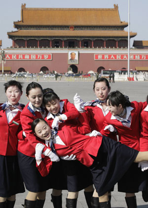 Hostesses for the National People's Congress (NPC) pose for pictures in Tiananmen Square during the third plenary session on the seventh day of the NPC in Beijing March 11, 2007. [Reuters]