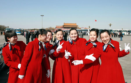 Hostesses for the National People's Congress (NPC) pose for pictures in Tiananmen Square during the third plenary session on the seventh day of the NPC in Beijing March 11, 2007. [Xinhua]