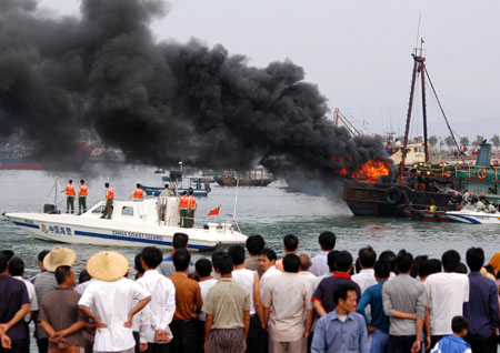 Dense smoke rises from a fishing boat after its oil tank exploded at a harbor in Sanya, in south China's island province of Hainan, March 21. Two fishermen injured in the blast.[newsphoto]