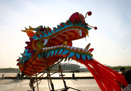 The head of a 5,056-metre-long dragon is seen in Luoyang, central China's Henan Province, April 3, 2007. The dragon, said to be world's longest, was built for a grand dragon dance performance on the April 10 Luoyang Peony Festival opening ceremony. [newsphoto]