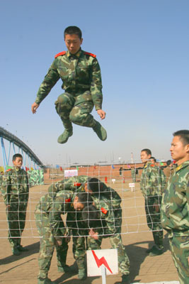 A policeman jumps over the 'electrified' barbed-wire with the help of others during a training session in Qinghuangdao, North China's Hebei Province April 5, 2007. [Xinhua]