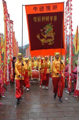 Locals organize a rally to pay tribute to Xuanyuan Huangdi, who is believed to be the ancestor of the Chinese nation, during annual Qingming Festival or Tomb Sweeping Day, a time to pay respects to the dearly departed, in Xiandu, east China's Zhejiang Province April 5, 2007. [Newsphoto]
