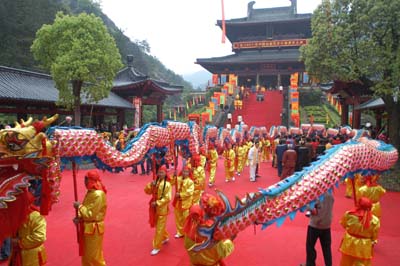 Locals perform Chinese traditional dragon dance to pay tribute to Xuanyuan Huangdi, who is believed to be the ancestor of the Chinese nation, during annual Qingming Festival or Tomb Sweeping Day, a time to pay respects to the dearly departed, in Xiandu, east China's Zhejiang Province April 5, 2007. [Newsphoto]