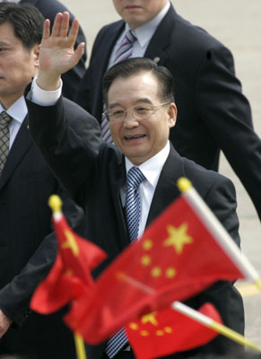 Chinese Premier Wen Jiabao waves before his departure for Japan at a military airport in Songnam, south of Seoul April 11, 2007. [Reuters]