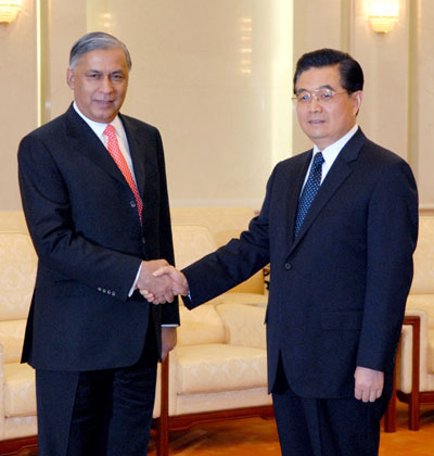 Pakistan's Prime Minister Shaukat Aziz (L) and China's President Hu Jintao shake hands at the Great Hall of the People in Beijing on April 18, 2007. [Reuters]