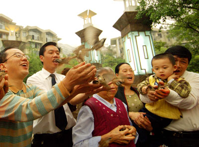 Residents set free birds to mark the mark the 38th 'World Earth Day' in Nan'an, Southwest China's Chongqing Municipality April 22, 2007. 'World Earth Day' is held on April 22 every year and intends to raise people's awareness of environmental protection. [Xinhua]