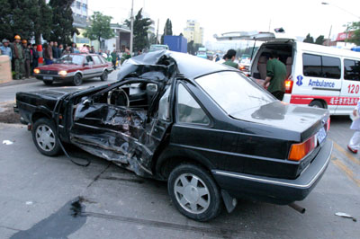A car is severely damaged when it rammed into a motorcycle on a street in Lianyungang, East China's Jiangsu Province April 28, 2007. The accident occurred at 6 pm on Saturday, killing three on the spot with three others in a critical conditon. [Newsphoto]