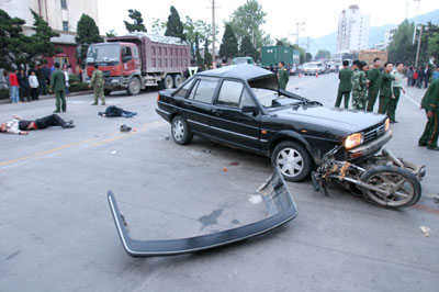The site of a car-motorcycle crash on a street in Lianyungang, East China's Jiangsu Province April 28, 2007. The accident occurred at 6 pm on Saturday, killing three on the spot with three others in a critical conditon. [Newsphoto]