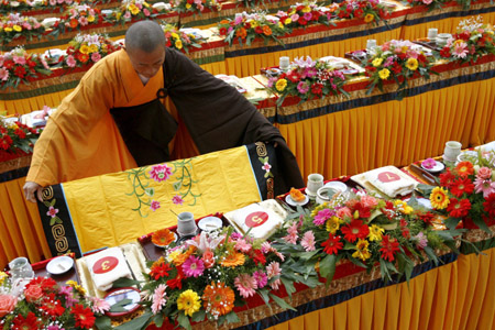 A Buddhist monk prepares seats for other monks before the opening ceremony of the Tianning pagoda at the Tianning temple in Changzhou, China's eastern province of Jiangsu, April 30, 2007. The pagoda, which is 13 storeys, or 153.79 m (504.56 ft) high, is the tallest in the world. [Reuters]