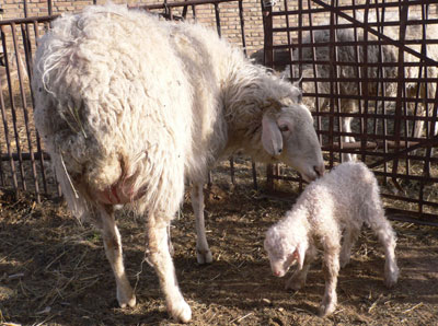 A clone sheep (R) is pictured with its mother several hours after its birth at a university in Huhhot, North China's Inner Mongolia Autonomous Region May 12, 2007. It is the first clone sheep in the region. [Xinhua]