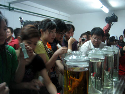 Online media reporters have a taste of the mellow wine at the brewery's wine storehouse May 21, 2007. [chinadaily.com.cn]
