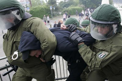 German riot police arrest a demonstrator during clashes at an anti-G8