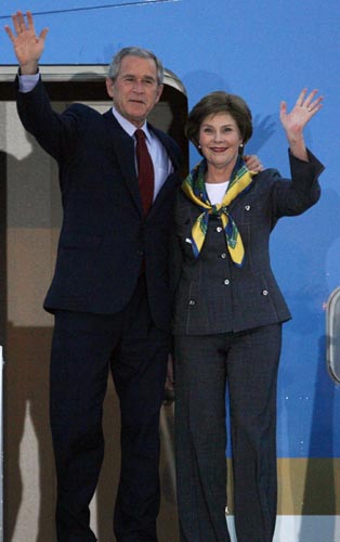 Laura Bush wave after arriving on Air Force One at Prague's Ruzyne Airport