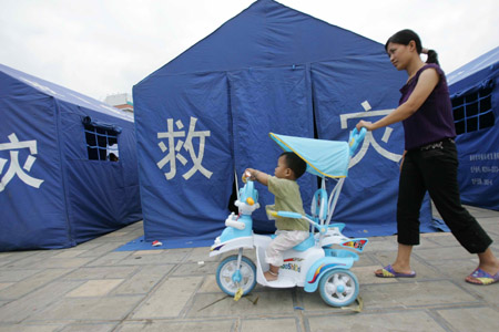 A woman attends her baby in front of tents built for earthquake evacuees in Ning'er, Southwest China's Yunnan Province, June 4, 2007. The quake, measuring 6.4 on the Richter scale, hit Ning'er on early Sunday morning, killing three people and injuring 313. More than 65,000 people have been evacuated from badly affected areas. [newsphoto]