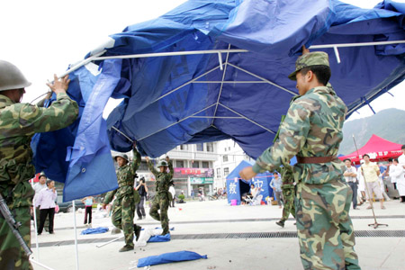 Soldiers build tents on a square to shelter earthquake evacuees in Ning'er, Southwest China's Yunnan Province, June 4, 2007. The quake, measuring 6.4 on the Richter scale, hit Ning'er on early Sunday morning, killing three people and injuring 313. More than 65,000 people have been evacuated from badly affected areas. [newsphoto]