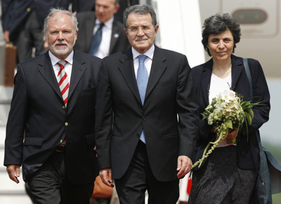 Romano Prodi and his wife Flavia at Rostock-Laage airport June 6, 2007. Leaders