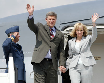 Harper and his wife Laureen wave as they arrive at Rostock-Laage airport June 6,