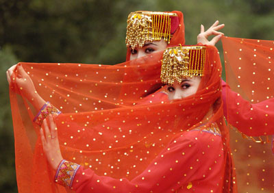| Two dancers perform a Tajik-style dance in Nanjing, East China's