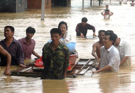 Villagers help a pregnant woman evacuating from her home in low-lying areas along a water-flooded street in Zi Jin County, South China's Guangdong Province June 10, 2007. It is the worst flood to threaten 15 towns of the county in 50 years. [Xinhua]