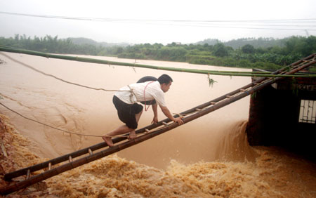 A man climbs a ladder to reach a drainage sluice station in Zi Jin County, South China's Guangdong Province June 10, 2007. It is the worst flood to threaten 15 towns of the county in 50 years. [Xinhua]