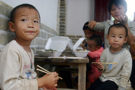 Children eat their lunch in an interim shelter in Zi Jin County,