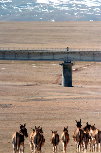 Equus kiangs travel near a bridge of the Qinghai-Tibet Railway in Golmud, Northwest China's Qinghai Province, June 13, 2007. The landscape, lakes and the frozen earth on the Tibetan Plateau have been well preserved and the wildlife's migration remained unchanged since the world's highest railway was put to use, the State Environmental Protection Administration says in a survey report. [Xinhua]