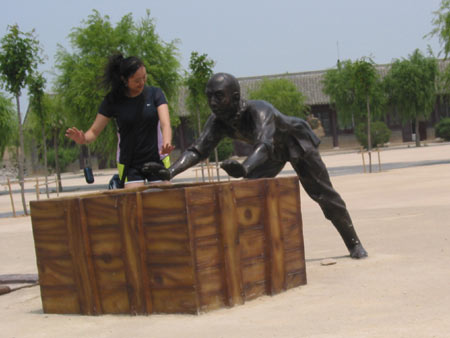 A tourist imitates a bronze statue at Fort Xipaotai in Yingkou City of Northeast China's Liaoning province. The relics, first constructed in 1882, were used as a military fortress against Japanese invaders in Sino-Japanese War during 1894-1895. The site has now become one of the key cultural relics under the state-level protection.