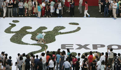 People use "zongzi", a traditional Chinese dish made from rice wrapped in bamboo leaves, to create the logo of 2010 Shanghai World Expo in Shanghai June 18, 2007, ahead of the upcoming Dragon Boat Festival. The festival commemorates the death of Chinese poet Qu Yuan who drowned in 277 B.C. [Reuters]
