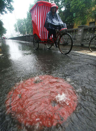 A resident cycles past a flooded street in Xiangfan, Central China's Hubei Province June 18. Torrential rains handicapped the draining system in the city and caused much trouble to residents. [newsphoto]