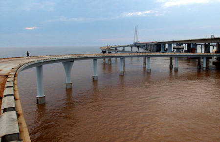 A visitor walks on a flyover of the bridge across the Hangzhou Bay in East China on June 26, 2007. The 36-kilometer (22-mile) bridge that its builders claim is the world's longest sea-crossing structure was formally linked-up Tuesday just south of Shanghai.[Xinhua]