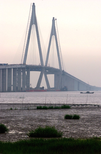 Cable towers of the bridge across the Hangzhou Bay in East China are seen on June 26, 2007. The 36-kilometer (22-mile) bridge that its builders claim is the world's longest sea-crossing structure was formally linked-up Tuesday just south of Shanghai.[Xinhua]