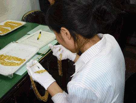 An employee carefully examines newly made Cuihua gold necklaces for quality. Cuihua is among 434 brands honored in 2006 by the Ministry of Commerce as a "China's Time-honored Brand," which were established more than a century ago. Related readings: Time-honored jewelry brand to go further