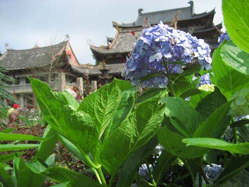 Guelder roses bloom in front of an old temple. As a state-level scenic spot, it has roughly 100 square kilometers' area for sightseeing, while the protected area is 200 square kilometers. The Taimu Mountains is a beautiful mountain resort with the characteristics of granite peaks and caves, which is famous for its natural wonders such as perilous peaks, misty fogs, peculiar stones and ancient temples, stone carves. It is divided into five tourist areas, namely the Taimu Mountain Ranges, the Nine-carp River and Falls, Qinchuan Seashore, the Fuyao islets and Sanyuan Lake, and two scenic spots, namely the Unfrequented City and the Ancient Castle, the Ruiyun Temple.