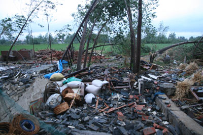 The debris of a house is seen after a tornado churned across Gaoyou, East China's Jiangsu Province July 3, 2007. The ravaging tornado killed five and injured 23 with three in a critical condition. More than 1,000 residents were affected and 400 houses destroyed. [Newsphoto]