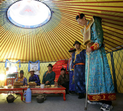 tallest living man, rests in a yurt during an Erdos Wedding Ceremony