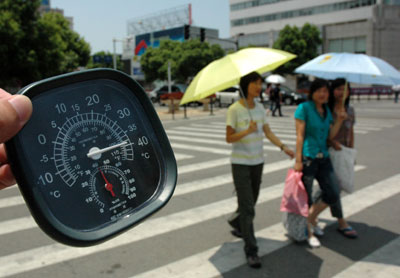 Women hold umbrellas to shield them from the sultry heat as a barometer stands at 38 C on a street in Taizhou, East China's Zhejiang Province July 18, 2007. Local temperatures will be above 37 C in the coming days, prompting the local observatory to issue a yellow warning, a sign of scorching heat, in areas including Hangzhou, Ningbo, Taizhou and Jinhua as well as Lishui. [Newsphoto]