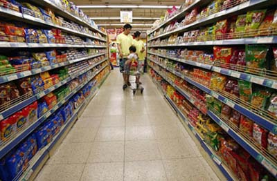 Customers walk in a supermarket in Shenyang, in northeastern