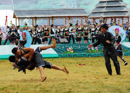 Wrestlers of Dong nationality perform at the opening ceremony of a cultural arts festival in Kaili, Southwest China's Guizhou Province July 23, 2007. [Xinhua]