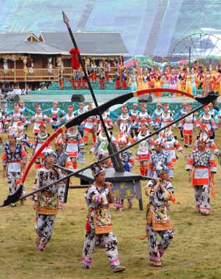 People perform at the opening ceremony of a cultural arts festival in Kaili, Southwest China's Guizhou Province July 23, 2007. [Xinhua]