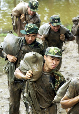 Soldiers carry sandbags to reinforce dikes in fear of breaches after weeks of pressure from high water levels on the swollen Huai river in Wuhe, East China's Anhui Province July 24, 2007. [Xinhua]