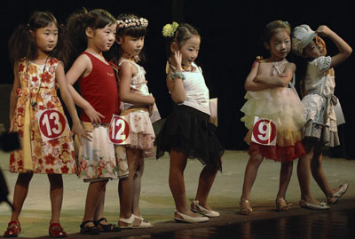 Children perform onstage during a modelling competition in Hefei in eastern China's Anhui province July 25, 2007. About 200 children aged 4 to 16 took part in the competition, according to local media. [Reuters]